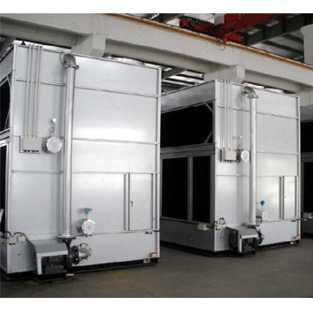 逆流式蒸發冷:是一種只利用水的潛熱換熱的蒸發冷,具有換熱面積大,不易產生冰堵和臟堵,能在各種環境下運行,特別是北方地區,效果最好,冬季無水干運行效果較好。進風形式為底部逆流進風,與下部的噴淋水逆向交替形成飽和濕熱空氣,熱量從頂部風機排出,水分有特殊結構的脫水器收回集水槽循環使用,內部空間沒有換熱填料,騰出更多的空間增加盤管的單位散熱面積。結構更加緊湊、占地小。特別適合與出水溫度要求接近當地濕球溫度的情況。
