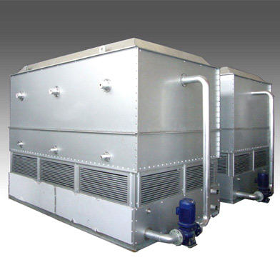 逆流式蒸發冷:是一種只利用水的潛熱換熱的蒸發冷,具有換熱面積大,不易產生冰堵和臟堵,能在各種環境下運行,特別是北方地區,效果最好,冬季無水干運行效果較好。進風形式為底部逆流進風,與下部的噴淋水逆向交替形成飽和濕熱空氣,熱量從頂部風機排出,水分有特殊結構的脫水器收回集水槽循環使用,內部空間沒有換熱填料,騰出更多的空間增加盤管的單位散熱面積。結構更加緊湊、占地小。特別適合與出水溫度要求接近當地濕球溫度的情況。