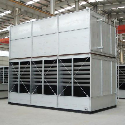 逆流式蒸發冷:是一種只利用水的潛熱換熱的蒸發冷,具有換熱面積大,不易產生冰堵和臟堵,能在各種環境下運行,特別是北方地區,效果最好,冬季無水干運行效果較好。進風形式為底部逆流進風,與下部的噴淋水逆向交替形成飽和濕熱空氣,熱量從頂部風機排出,水分有特殊結構的脫水器收回集水槽循環使用,內部空間沒有換熱填料,騰出更多的空間增加盤管的單位散熱面積。結構更加緊湊、占地小。特別適合與出水溫度要求接近當地濕球溫度的情況。