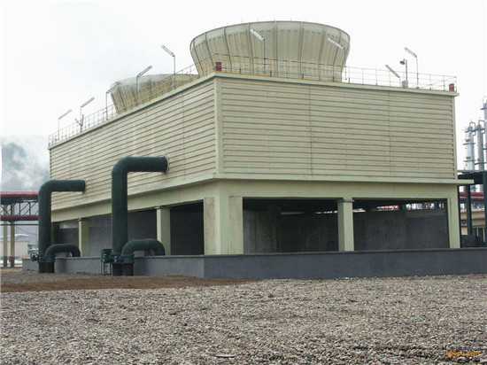 2、橫流式塔進水管由兩邊分別裝設,并連接到配水箱,用戶應在接管處設置蝶閥,以供調節流量。進水管可以由下面的干管引入,也可以把干管放在塔上,這時其管道支架應落在冷卻塔側面的架上。出水管可選任一進風方向由塔底水箱接出。